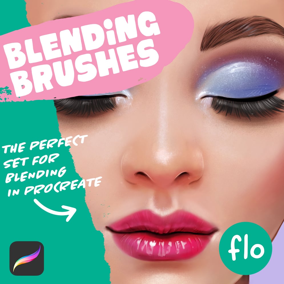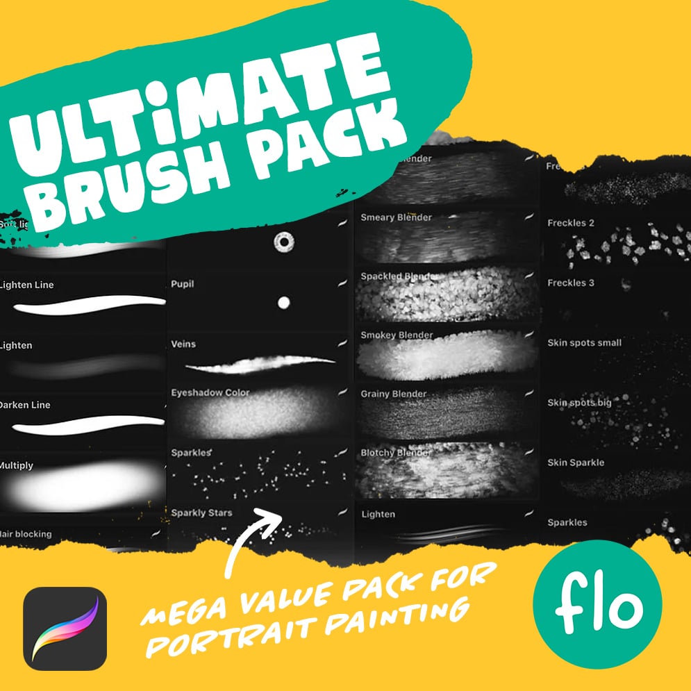 This Procreate Brush Pack contains the Basic Flo brushes, Blender brushes, eye brushes, hair brushes and wonderful textured skin brushes.
