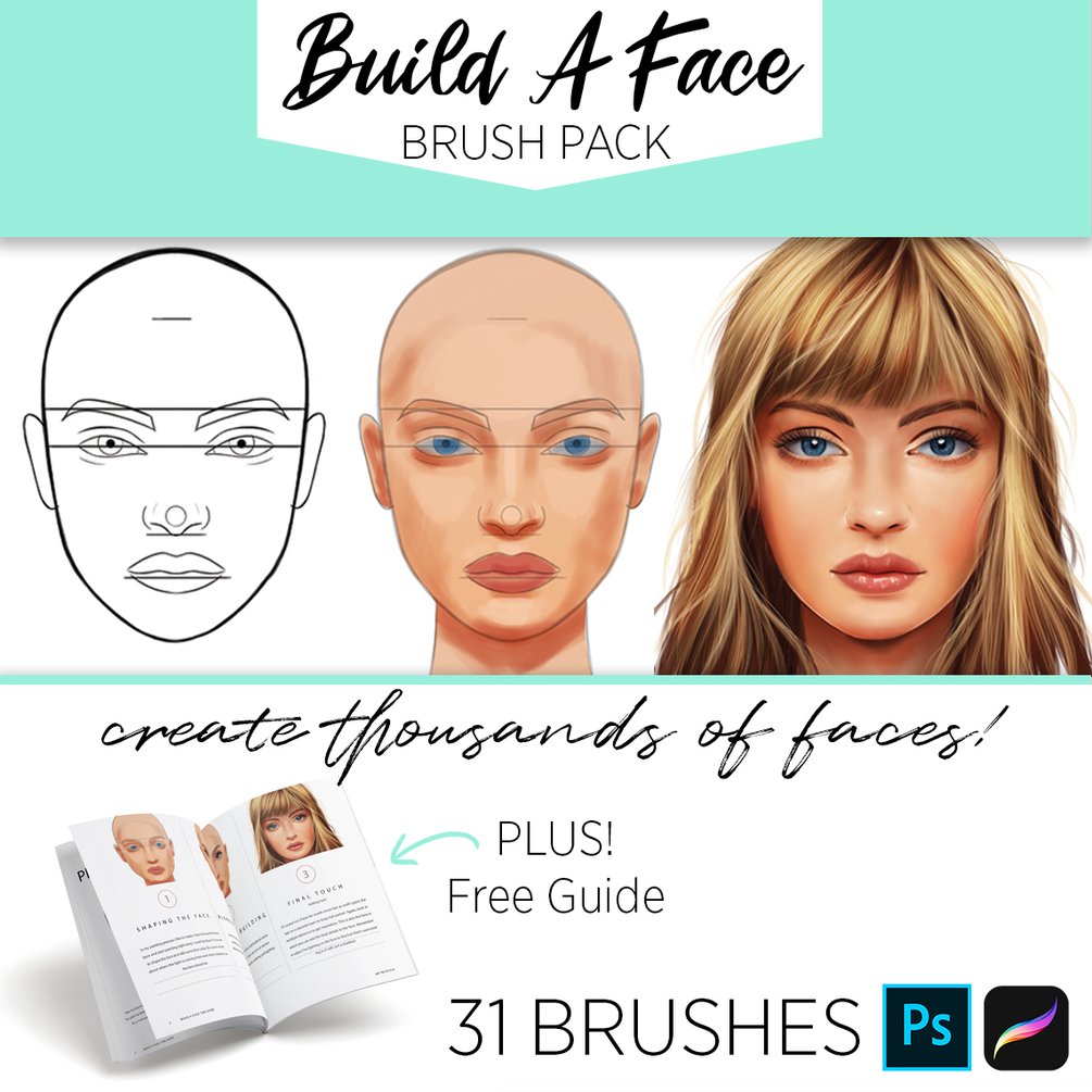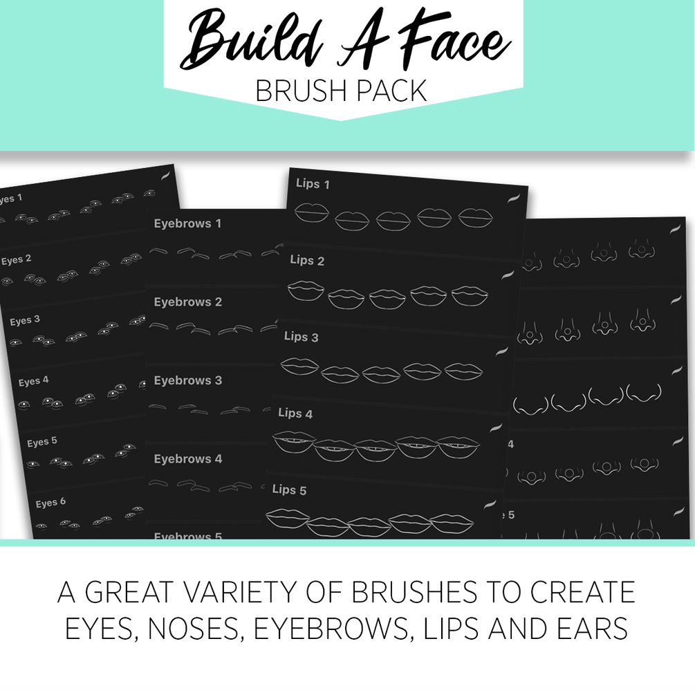 With this brush pack you will be creating a great variety of female faces in no time! The Build A Face Brushpack for Procreate and Photoshop contains brushes for eyes, noses, lips, eyebrows and ears! Plus 3 basic head brushes.