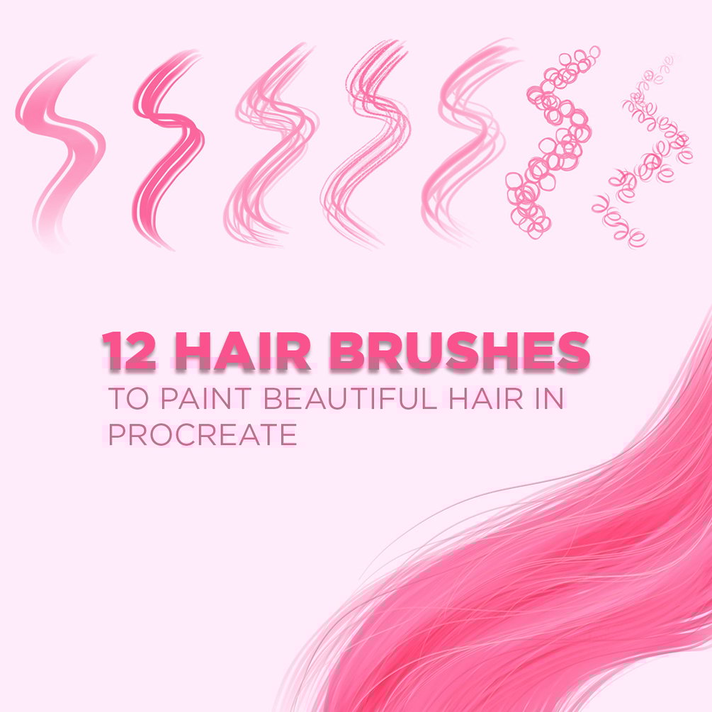 These are my favorite brushes to paint hair in Procreate. The pack contains brushes for blocking in the basic shape of the hair, adding hair texture, loose strands, individual hairs and some cool curl brushes.