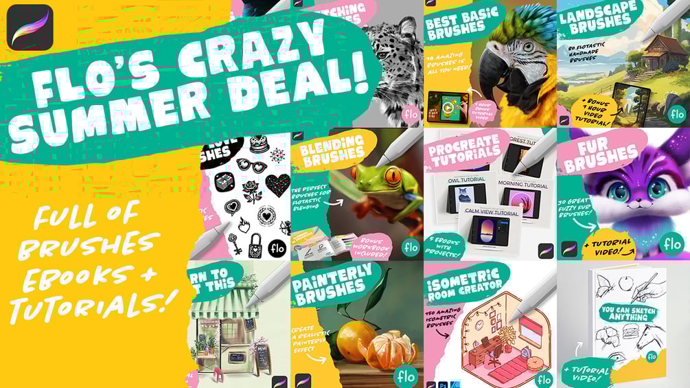 Flo's Crazy Summer deal is back! A bundle full of amazing Procreate brushes and tutorials, enough to entertain you all summer long 😃 Floscrazysummer to activate the 85% discount!