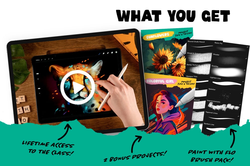 The class comes with 18 Flotastic brushes selected from a variety of my special brush packs + 2 bonus projects.