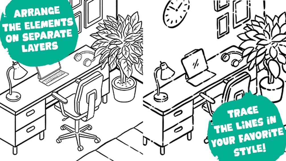 When using these isometric room brushes, create a new layer for each element you add, that way you can easily move and transform the object you have added. Once you have arranged all the elements, you can merge the layers, lower the opacity and then trace your complete isometric room on a new layer. While tracing your room, you can add your preferred style and use your favorite line art brushes. The possibilities are endless!
